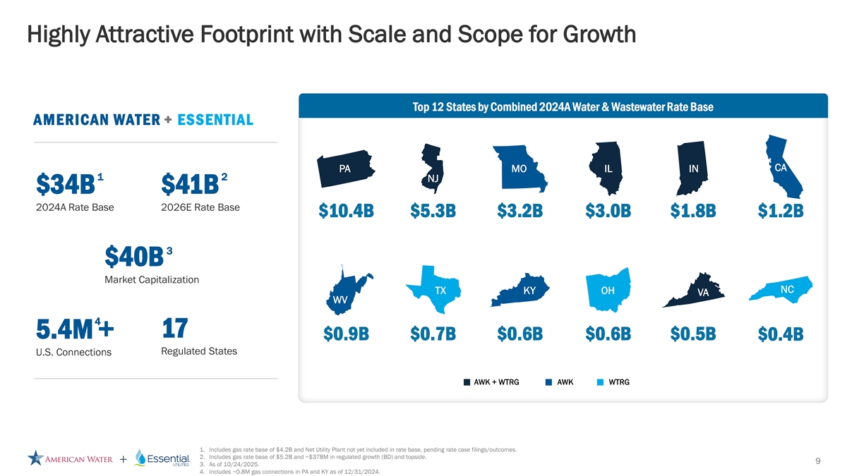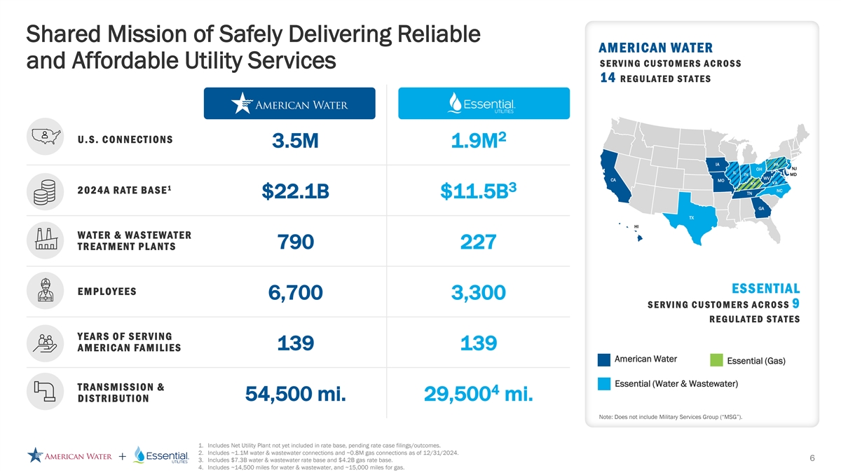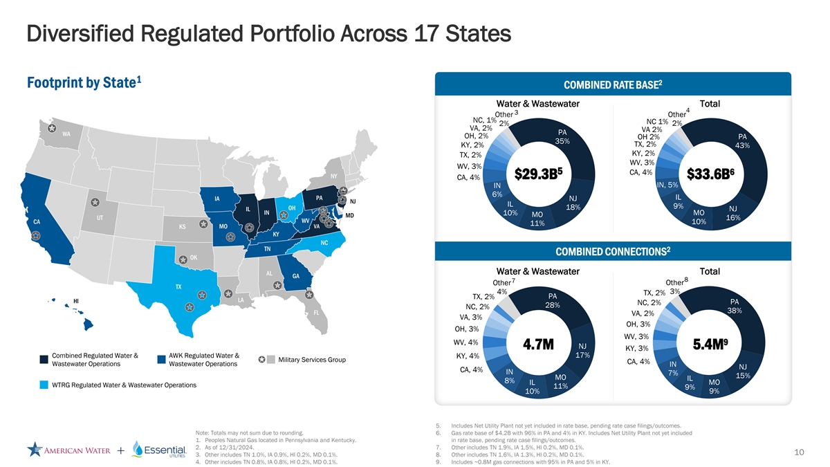 | | Bolsters significant regulated water and wastewater utility providers. The combined company would have a water and wastewater rate base of approximately $29.3 billion1 as of the end of 2024, with approximately 4.7 million water/wastewater connections across 17 states and on 18 military installations. With a larger footprint and customer base as well as increased geographic diversity, the combined company will be well positioned to deliver operational leverage, better customer service and broader customer reach. |