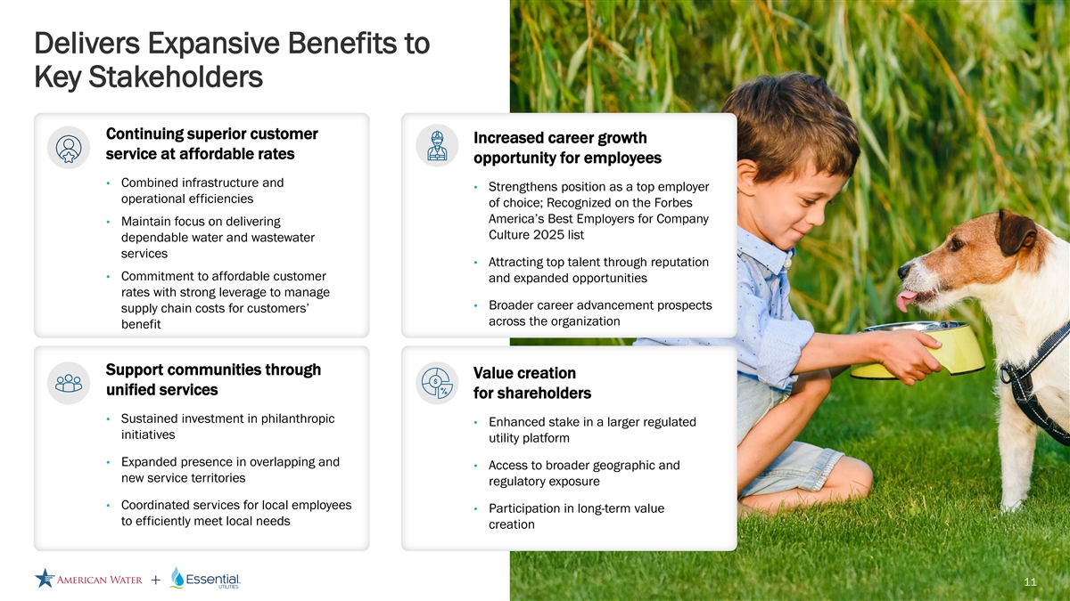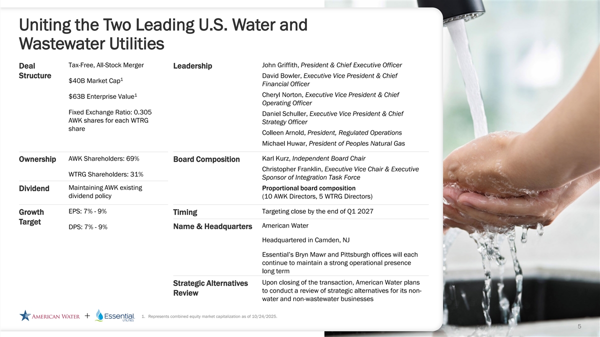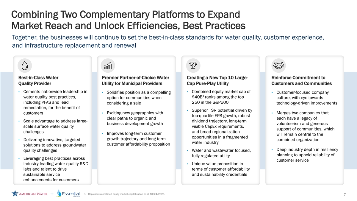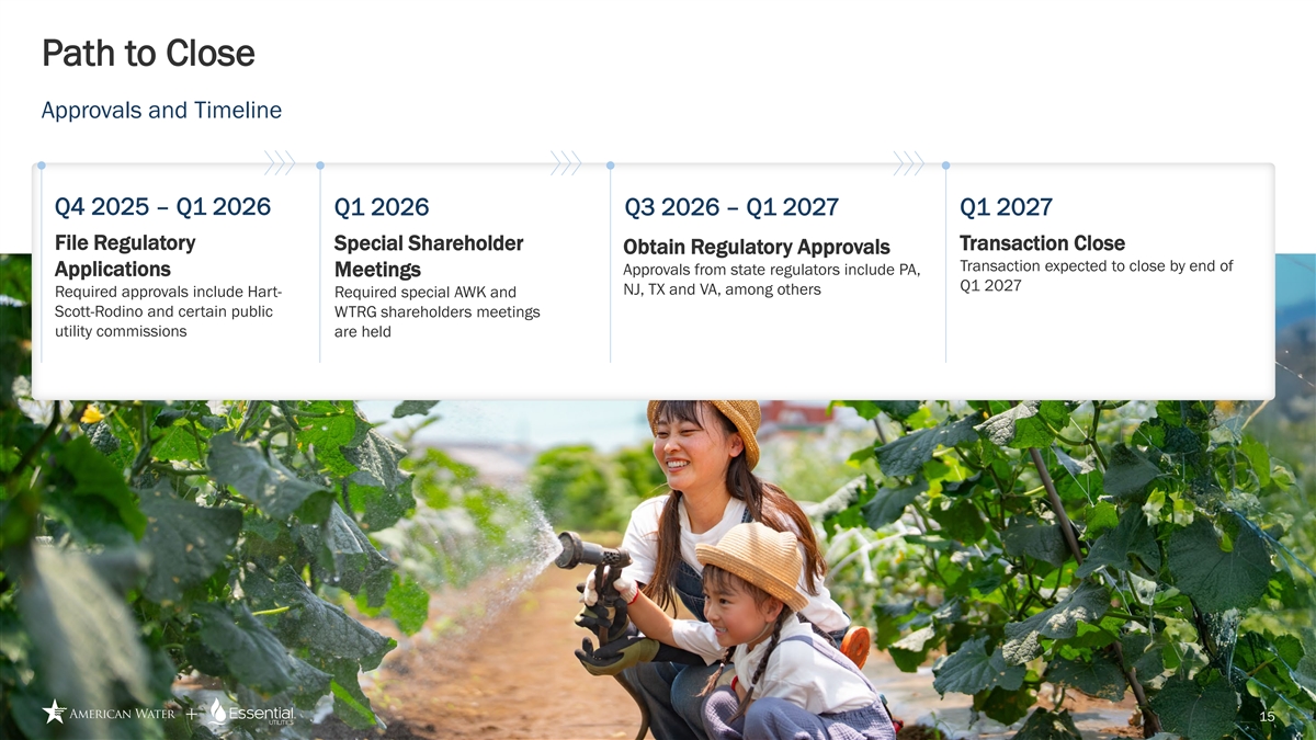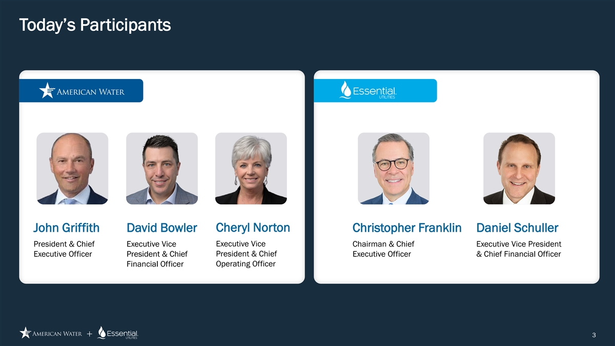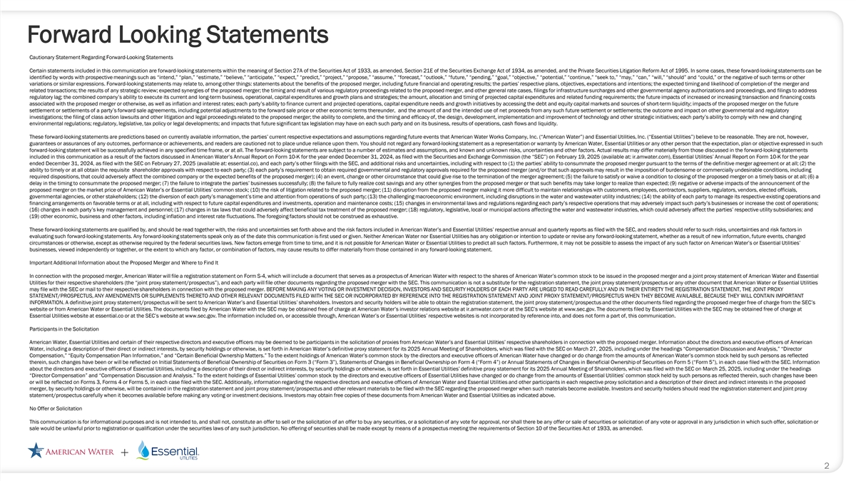 Forward Looking Statements Disclosure Cautionary Statement Regarding Forward-Looking Statements Certain statements included in this communication are forward-looking statements within the meaning of Section 27A of the Securities Act of 1933, as amended, Section 21E of the Securities Exchange Act of 1934, as amended, and the Private Securities Litigation Reform Act of 1995. In some cases, these forward-looking statements can be identified by words with prospective meanings such as “intend,” “plan,” “estimate,” “believe,” “anticipate,” “expect,” “predict,” “project,” “propose,” “assume,” “forecast,” “outlook,” “future,” “pending,” “goal,” “objective,” “potential,” “continue,” “seek to,” “may,” “can,” “will,” “should” and “could,” or the negative of such terms or other variations or similar expressions. Forward-looking statements may relate to, among other things: statements about the benefits of the proposed merger, including future financial and operating results; the parties’ respective plans, objectives, expectations and intentions; the expected timing and likelihood of completion of the merger and related transactions; the results of any strategic review; expected synergies of the proposed merger; the timing and result of various regulatory proceedings related to the proposed merger, and other general rate cases, filings for infrastructure surcharges and other governmental agency authorizations and proceedings, and filings to address regulatory lag; the combined company’s ability to execute its current and long-term business, operational, capital expenditures and growth plans and strategies; the amount, allocation and timing of projected capital expenditures and related funding requirements; the future impacts of increased or increasing transaction and financing costs associated with the proposed merger or otherwise, as well as inflation and interest rates; each party’s ability to finance current and projected operations, capital expenditure needs and growth initiatives by accessing the debt and equity capital markets and sources of short-term liquidity; impacts of the proposed merger on the future settlement or settlements of a party’s forward sale agreements, including potential adjustments to the forward sale price or other economic terms thereunder, and the amount of and the intended use of net proceeds from any such future settlement or settlements; the outcome and impact on other governmental and regulatory investigations; the filing of class action lawsuits and other litigation and legal proceedings related to the proposed merger; the ability to complete, and the timing and efficacy of, the design, development, implementation and improvement of technology and other strategic initiatives; each party’s ability to comply with new and changing environmental regulations; regulatory, legislative, tax policy or legal developments; and impacts that future significant tax legislation may have on each such party and on its business, results of operations, cash flows and liquidity. These forward-looking statements are predictions based on currently available information, the parties’ current respective expectations and assumptions regarding future events that American Water Works Company, Inc. (“American Water”) and Essential Utilities, Inc. (“Essential Utilities”) believe to be reasonable. They are not, however, guarantees or assurances of any outcomes, performance or achievements, and readers are cautioned not to place undue reliance upon them. You should not regard any forward-looking statement as a representation or warranty by American Water, Essential Utilities or any other person that the expectation, plan or objective expressed in such forward-looking statement will be successfully achieved in any specified time frame, or at all. The forward-looking statements are subject to a number of estimates and assumptions, and known and unknown risks, uncertainties and other factors. Actual results may differ materially from those discussed in the forward-looking statements included in this communication as a result of the factors discussed in American Water’s Annual Report on Form 10-K for the year ended December 31, 2024, as filed with the Securities and Exchange Commission (the “SEC”) on February 19, 2025 (available at: ir.amwater.com), Essential Utilities’ Annual Report on Form 10-K for the year ended December 31, 2024, as filed with the SEC on February 27, 2025 (available at: essential.co), and each party’s other filings with the SEC, and additional risks and uncertainties, including with respect to (1) the parties’ ability to consummate the proposed merger pursuant to the terms of the definitive merger agreement or at all; (2) the ability to timely or at all obtain the requisite shareholder approvals with respect to each party; (3) each party’s requirement to obtain required governmental and regulatory approvals required for the proposed merger (and/or that such approvals may result in the imposition of burdensome or commercially undesirable conditions, including required dispositions, that could adversely affect the combined company or the expected benefits of the proposed merger); (4) an event, change or other circumstance that could give rise to the termination of the merger agreement; (5) the failure to satisfy or waive a condition to closing of the proposed merger on a timely basis or at all; (6) a delay in the timing to consummate the proposed merger; (7) the failure to integrate the parties’ businesses successfully; (8) the failure to fully realize cost savings and any other synergies from the proposed merger or that such benefits may take longer to realize than expected; (9) negative or adverse impacts of the announcement of the proposed merger on the market price of American Water’s or Essential Utilities’ common stock; (10) the risk of litiga