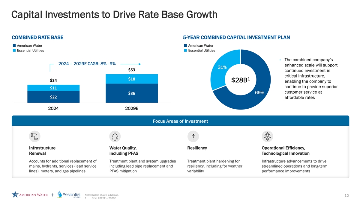 | | Delivers attractive, long-term capital investment profile with ability to provide increased solutions to water and wastewater challenges across an expanded footprint. American Water expects to maintain its long-term rate base growth target of 8-9% upon the closing of the merger, positioning the company to continue to provide high quality service to customers. The combined company will continue to allocate capital to infrastructure renewal, resiliency, water quality, technology and growth projects. |