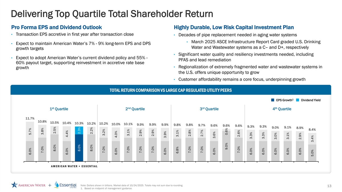 Capital Investments to Drive Rate Base Growth COMBINED RATE BASE 5-YEAR COMBINED CAPITAL INVESTMENT PLAN American Water American Water Essential Utilities Essential Utilities • The combined company’s 2024 – 2029E CAGR: 8% - 9% enhanced scale will support 31% $53 continued investment in critical infrastructure, $18 1 $34 $28B enabling the company to continue to provide superior $11 customer service at 69% $36 $22 affordable rates 2024 2029E Focus Areas of Investment Infrastructure Water Quality, Resiliency Operational Efficiency, Renewal including PFAS Technological Innovation Accounts for additional replacement of Treatment plant and system upgrades Treatment plant hardening for Infrastructure advancements to drive mains, hydrants, services (lead service including lead pipe replacement and resiliency, including for weather streamlined operations and long-term lines), meters, and gas pipelines PFAS mitigation variability performance improvements Note: Dollars shown in billions. 12 1. From 2025E – 2029E.