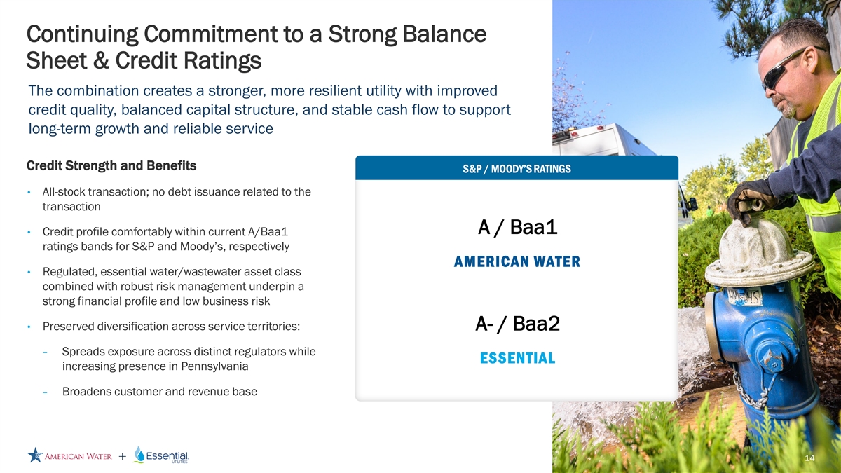 Delivering Top Quartile Total Shareholder Return Pro Forma EPS and Dividend Outlook Highly Durable, Low Risk Capital Investment Plan • Transaction EPS accretive in first year after transaction close • Decades of pipe replacement needed in aging water systems • March 2025 ASCE Infrastructure Report Card graded U.S. Drinking • Expect to maintain American Water’s 7% - 9% long-term EPS and DPS Water and Wastewater systems as a C– and D+, respectively growth targets • Significant water quality and resiliency investments needed, including • Expect to adopt American Water’s current dividend policy and 55% - PFAS and lead remediation 60% payout target, supporting reinvestment in accretive rate base • Regionalization of extremely fragmented water and wastewater systems in growth the U.S. offers unique opportunity to grow • Customer affordability remains a core focus, underpinning growth TOTAL RETURN COMPARISON VS LARGE CAP REGULATED UTILITY PEERS 1 EPS Growth Dividend Yield st nd rd th 1 Quartile 2 Quartile 3 Quartile 4 Quartile 11.7% 10.8% 10.5% 10.4% 10.3% 10.2% 10.2% 10.0% 10.1% 9.9% 9.9% 9.9% 9.8% 9.8% 9.7% 9.6% 9.6% 9.6% 9.3% 9.3% 9.1% 9.0% 8.9% 8.4% A ME R I C A N W ATE R + E S S E N T I A L Note: Dollars shown in billions. Market data of 10/24/2025. Totals may not sum due to rounding. 13 1. Based on midpoint of management guidance. 6.0% 5.7% 7.0% 3.8% 8.0% 2.5% 6.0% 4.4% 8.0% 2.3% 8.0% 2.2% 7.0% 3.2% 6.0% 4.0% 7.0% 3.1% 7.0% 2.9% 7.0% 2.9% 6.0% 3.9% 6.8% 3.1% 7.0% 2.8% 7.0% 2.7% 6.0% 3.6% 9.0% 0.6% 7.0% 2.6% 6.0% 3.3% 6.0% 3.3% 6.0% 3.0% 6.0% 3.1% 6.0% 2.9% 5.0% 3.4%