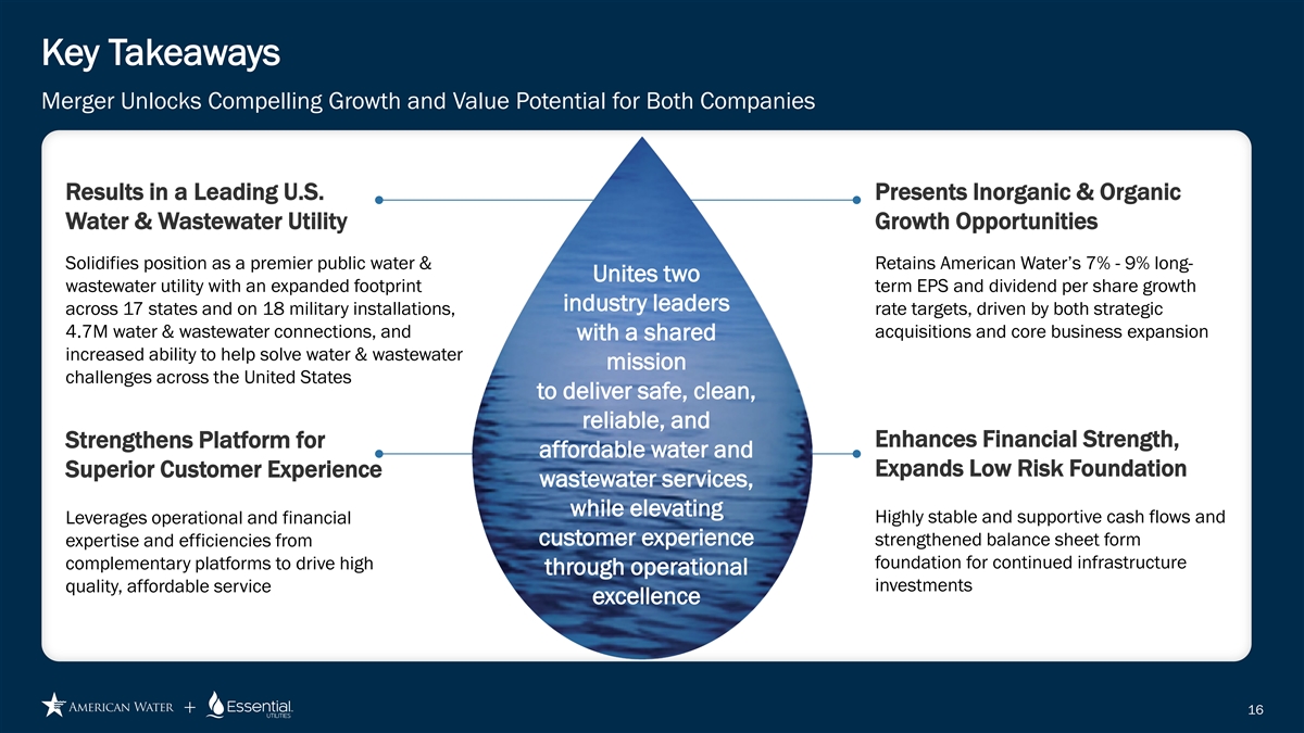Path to Close Approvals and Timeline Q4 2025 – Q1 2026 Q1 2026 Q3 2026 – Q1 2027 Q1 2027 File Regulatory Special Shareholder Transaction Close Obtain Regulatory Approvals Transaction expected to close by end of Approvals from state regulators include PA, Applications Meetings Q1 2027 NJ, TX and VA, among others Required approvals include Hart- Required special AWK and Scott-Rodino and certain public WTRG shareholders meetings utility commissions are held 15