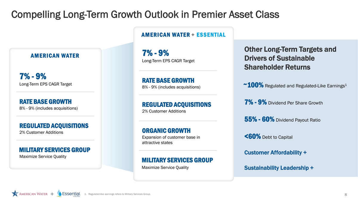 Compelling Long-Term Growth Outlook in Premier Asset Class AMERICAN WATER + ESSENTIAL Other Long-Term Targets and 7% - 9% AMERICAN WATER Drivers of Sustainable Long-Term EPS CAGR Target Shareholder Returns 7% - 9% RATE BASE GROWTH Long-Term EPS CAGR Target 1 100% Regulated and Regulated-Like Earnings 8% - 9% (includes acquisitions) ~ RATE BASE GROWTH 7% - 9% Dividend Per Share Growth REGULATED ACQUISITIONS 8% - 9% (includes acquisitions) 2% Customer Additions 55% - 60% Dividend Payout Ratio REGULATED ACQUISITIONS ORGANIC GROWTH 2% Customer Additions Expansion of customer base in <60% Debt to Capital attractive states MILITARY SERVICES GROUP Customer Affordability + Maximize Service Quality MILITARY SERVICES GROUP Maximize Service Quality Sustainability Leadership + 1. Regulated-like earnings refers to Military Services Group. 8